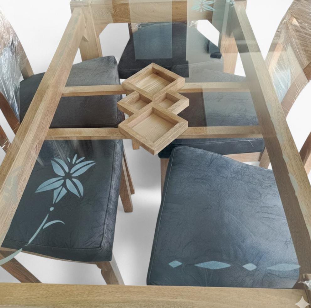 Materiales: Estructura robusta en Madera de Roble de alta densidad. Superficie de Vidrio Templado de Seguridad de alto impacto. Sillas tapizadas con tecnología doble: Antifluido + Antirasguño (especial para mascotas).